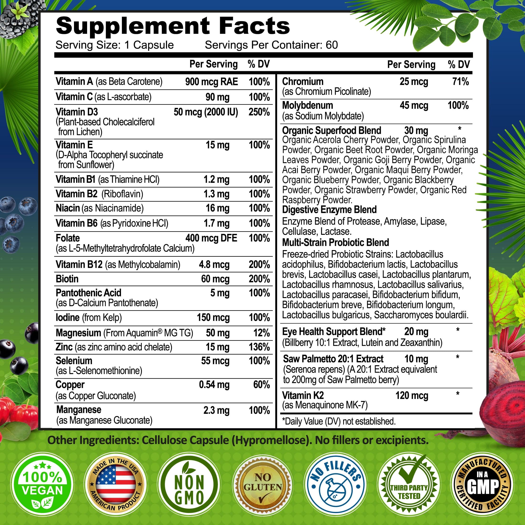 Enriched with Organic Superfood Blend, this superior-quality, plant-based multivitamin supports optimal health. Made without artificial fillers, colors, or flavors, it contains NO magnesium stearate, preservatives, or GMOs. Free from gluten, wheat, nuts, dairy, eggs, shellfish, soy, and gelatin, it’s crafted in a GMP-certified facility in the USA and rigorously third-party tested to ensure purity and quality.