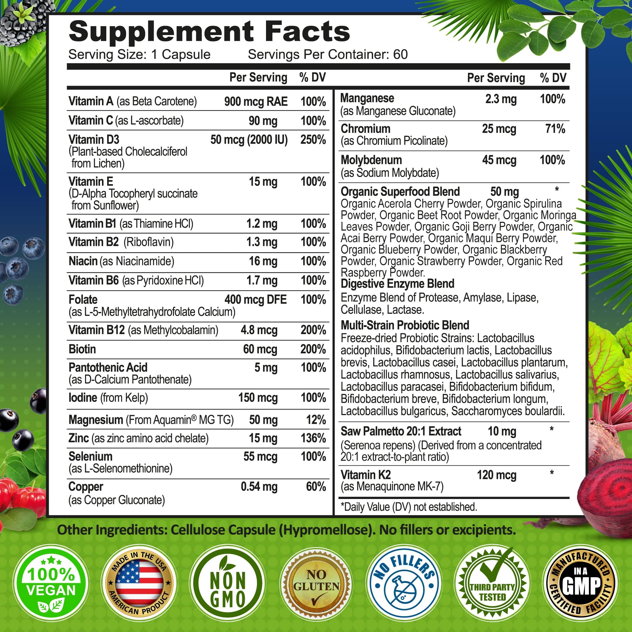 Vitamins & Minerals: Vitamin A (Beta Carotene), Vitamin C (L-ascorbate), Vitamin D3 (Plant-based Cholecalciferol from Lichen) (2000 IU), Vitamin E (D-Alpha Tocopheryl succinate from Sunflower), Vitamin B1 (Thiamine HCl), Vitamin B2 (Riboflavin), Niacin (Niacinamide), Vitamin B6 (Pyridoxine HCl), Folate (L-5-Methyltetrahydrofolate Calcium), Vitamin B12 (Methylcobalamin), Biotin, Pantothenic Acid (D-Calcium Pantothenate), Iodine (from Kelp), Magnesium (Aquamin® MG TG), Zinc (Zinc Amino Acid Chelate), Selenium (L-Selenomethionine), Copper (Copper Gluconate), Manganese (Manganese Gluconate), Chromium (Chromium Picolinate), Molybdenum (Sodium Molybdate), Vitamin K2 (Menaquinone MK-7). Organic Superfood Blend: Organic Alfalfa Leaf Powder, Organic Barley Grass Powder, Organic Broccoli Powder, Organic Moringa Leaf Powder, Organic Spinach Powder, Organic Spirulina Powder, Organic Wheatgrass Powder, Organic Beet Root Powder, Organic Tomato Powder, Organic Dulse Powder. Saw Palmetto 20:1 Extract: Equivalent to 200 mg of Saw Palmetto berry. Digestive Enzyme Blend: Protease, Amylase, Lipase, Cellulase, Lactase. Multi-Strain Probiotics Blend: Lactobacillus acidophilus, Bifidobacterium lactis, Lactobacillus brevis, Lactobacillus casei, Lactobacillus plantarum, Lactobacillus rhamnosus, Lactobacillus salivarius, Lactobacillus paracasei, Bifidobacterium bifidum, Bifidobacterium breve, Bifidobacterium longum, Lactobacillus bulgaricus, Saccharomyces boulardii.