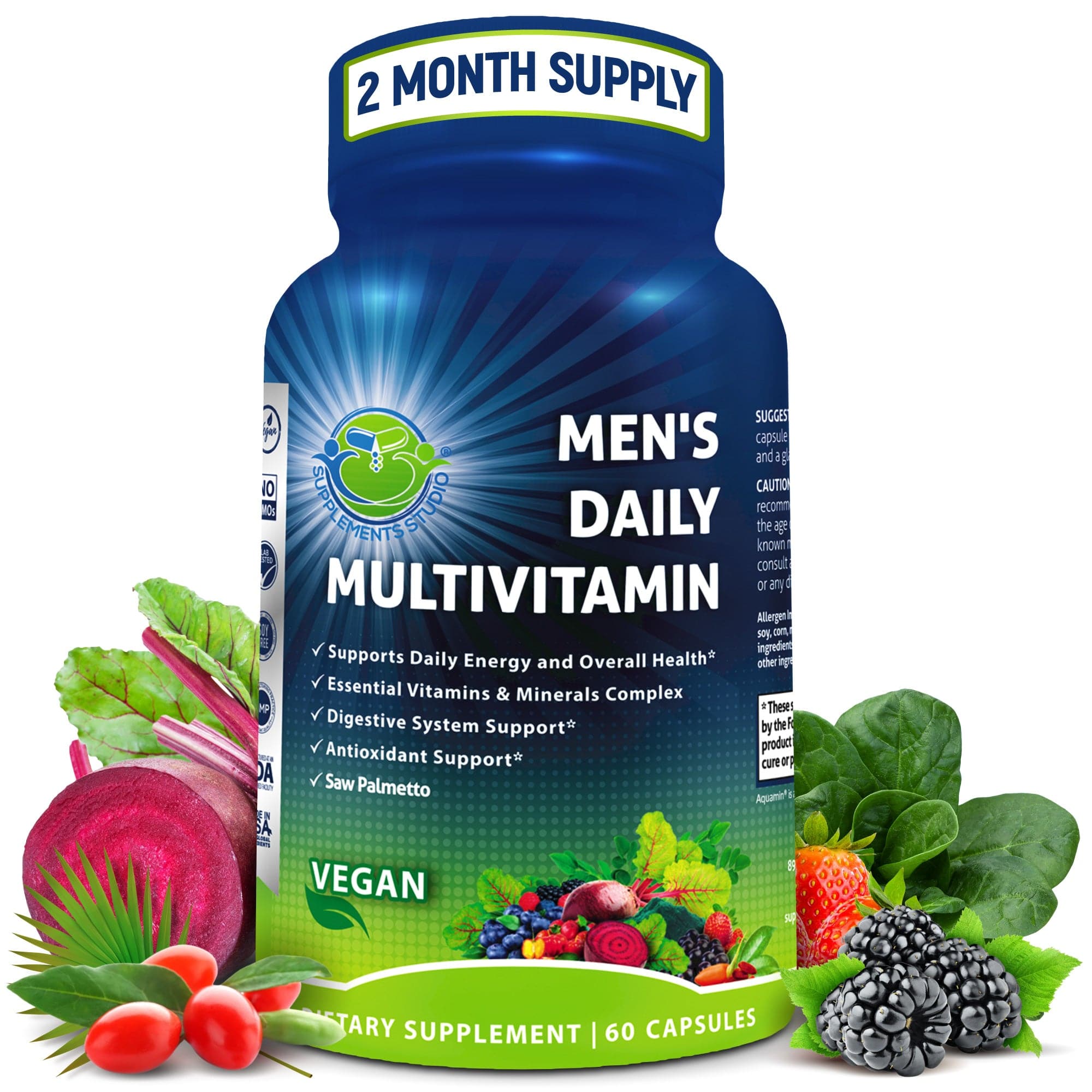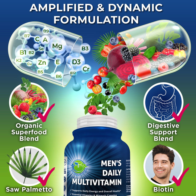 This comprehensive men's daily vitamin supplement supports energy, immunity, and vitality. It is expertly-formulated with Saw Palmetto, known for supporting prostate health and men’s wellness; Biotin, which promotes healthy hair and skin; Probiotics and Digestive Enzymes to support gut health and enhance nutrient absorption; and an Organic Superfood Blend, making it one of the most comprehensive men’s vitamins available.