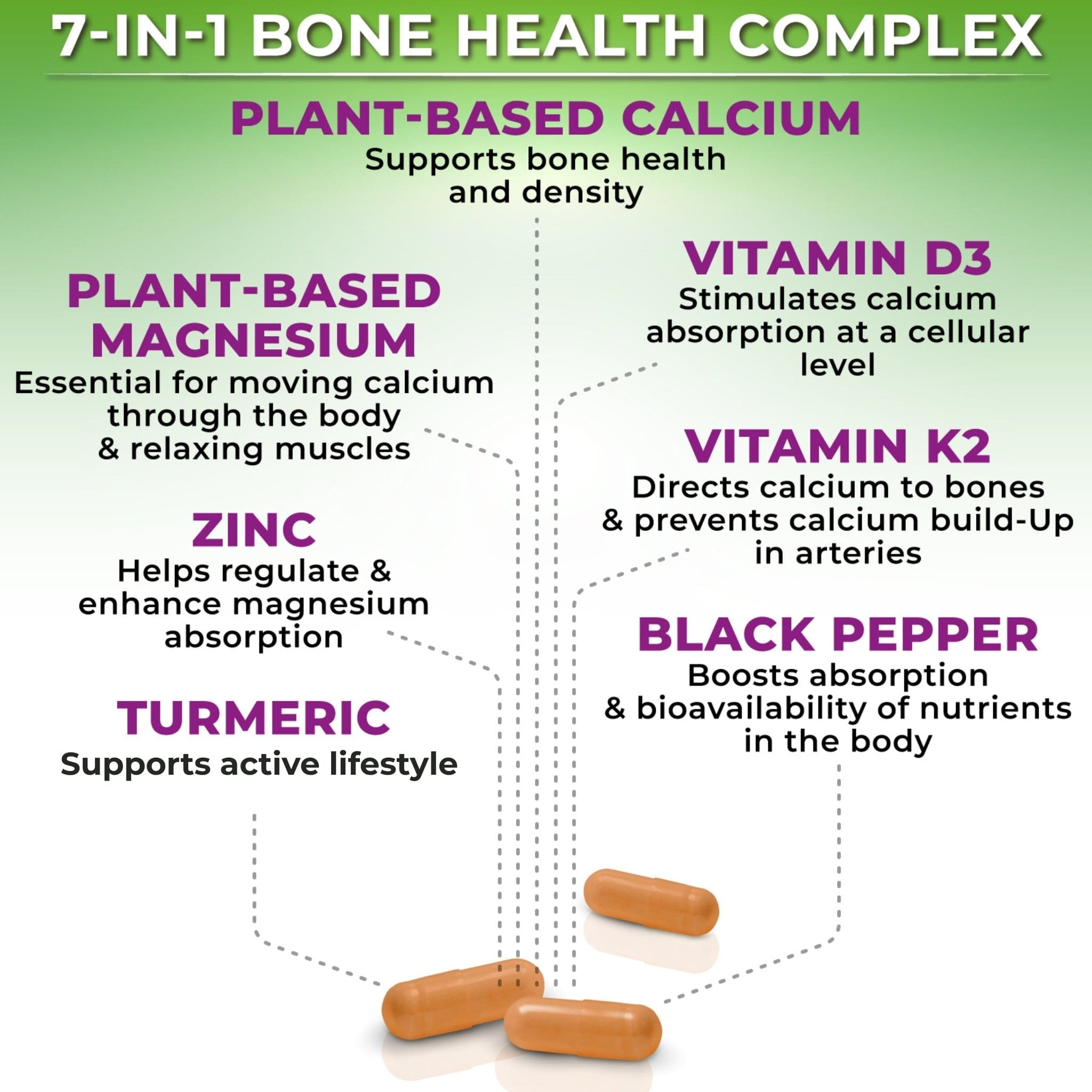 Magnesium and vitamin D3 are essential for calcium bioavailability. Zinc enhances magnesium absorption, while vitamin K2 directs calcium to the bones. Turmeric supports joints, and black pepper improves nutrient bioavailability.
