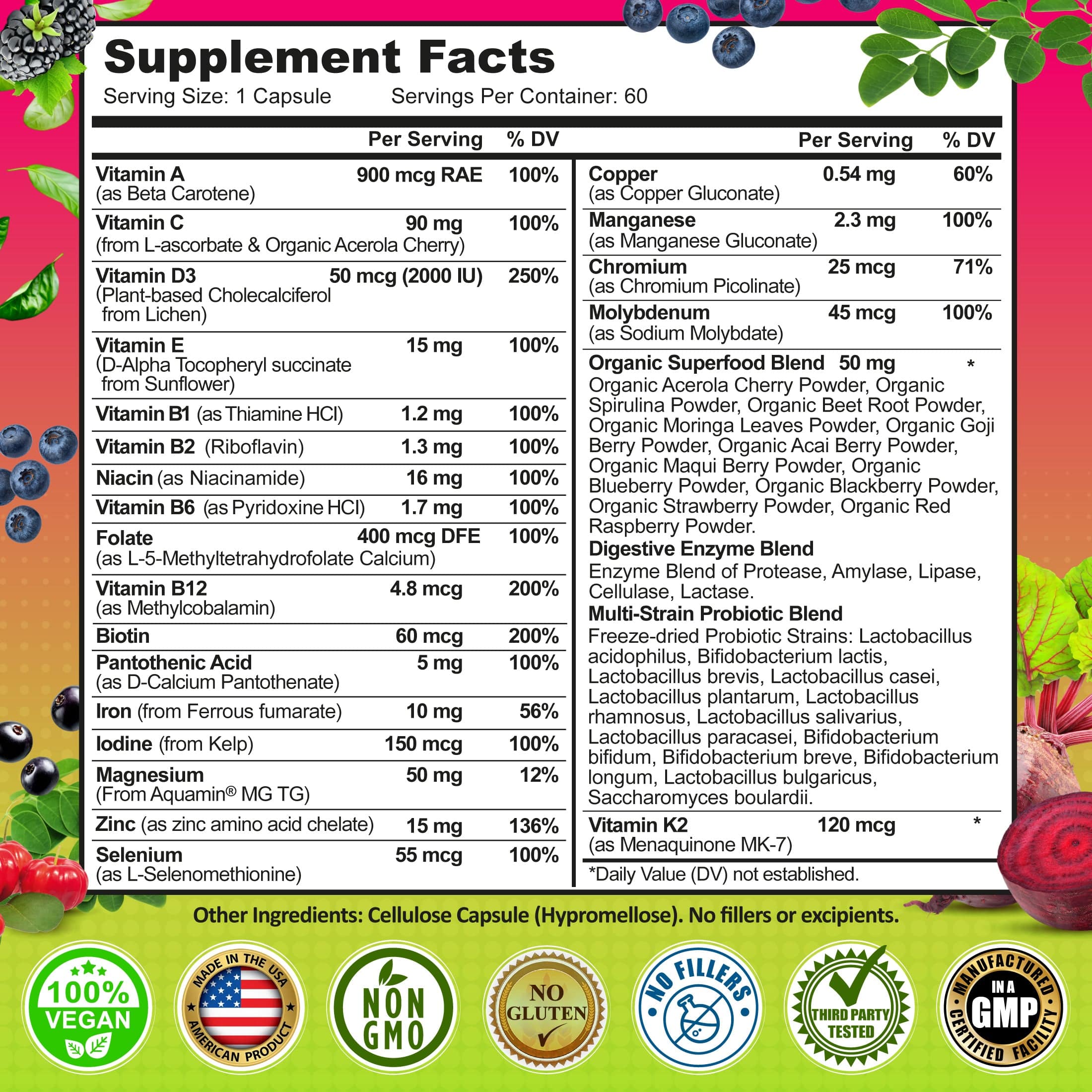 Vitamins & Minerals: Vitamin A (Beta Carotene), Vitamin C (L-ascorbate), Vitamin D3 (Plant-based Cholecalciferol from Lichen) (2000 IU), Vitamin E (D-Alpha Tocopheryl succinate from Sunflower), Vitamin B1 (Thiamine HCl), Vitamin B2 (Riboflavin), Niacin (Niacinamide), Vitamin B6 (Pyridoxine HCl), Folate (L-5-Methyltetrahydrofolate Calcium), Vitamin B12 (Methylcobalamin), Biotin, Pantothenic Acid (D-Calcium Pantothenate), Iron (Ferrous Fumarate), Iodine (from Kelp). Organic Green Power Blend: Organic Alfalfa Leaf Powder, Organic Barley Grass Powder, Organic Broccoli Powder, Organic Moringa Leaf Powder, Organic Spinach Powder, Organic Spirulina Powder, Organic Wheat Grass Powder, Organic Beet Root Powder, Organic Tomato Powder, Organic Dulse Powder. Enzyme Immune Blend: Protease, Amylase, Lipase, Cellulase, Lactase.
