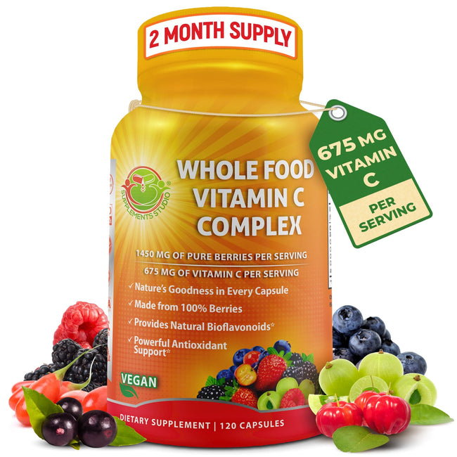 Discover the ultimate organic vitamin C with our Whole Food Vitamin C Complex. This powerful blend contains nine organic berries, including acerola, amla, goji, maqui, and more, delivering a high-potency, bioavailable 675mg of vitamin C per serving. With the most comprehensive dosage of whole food vitamin C on the market, each serving provides more vitamin C than four oranges or four bell peppers. Gentle on the stomach, easy to absorb, and rich in antioxidants, it supports immune health, collagen production, and overall vitality. Vegan, non-GMO, and crafted under strict GMP quality standards, it’s the perfect daily boost powered by nature.