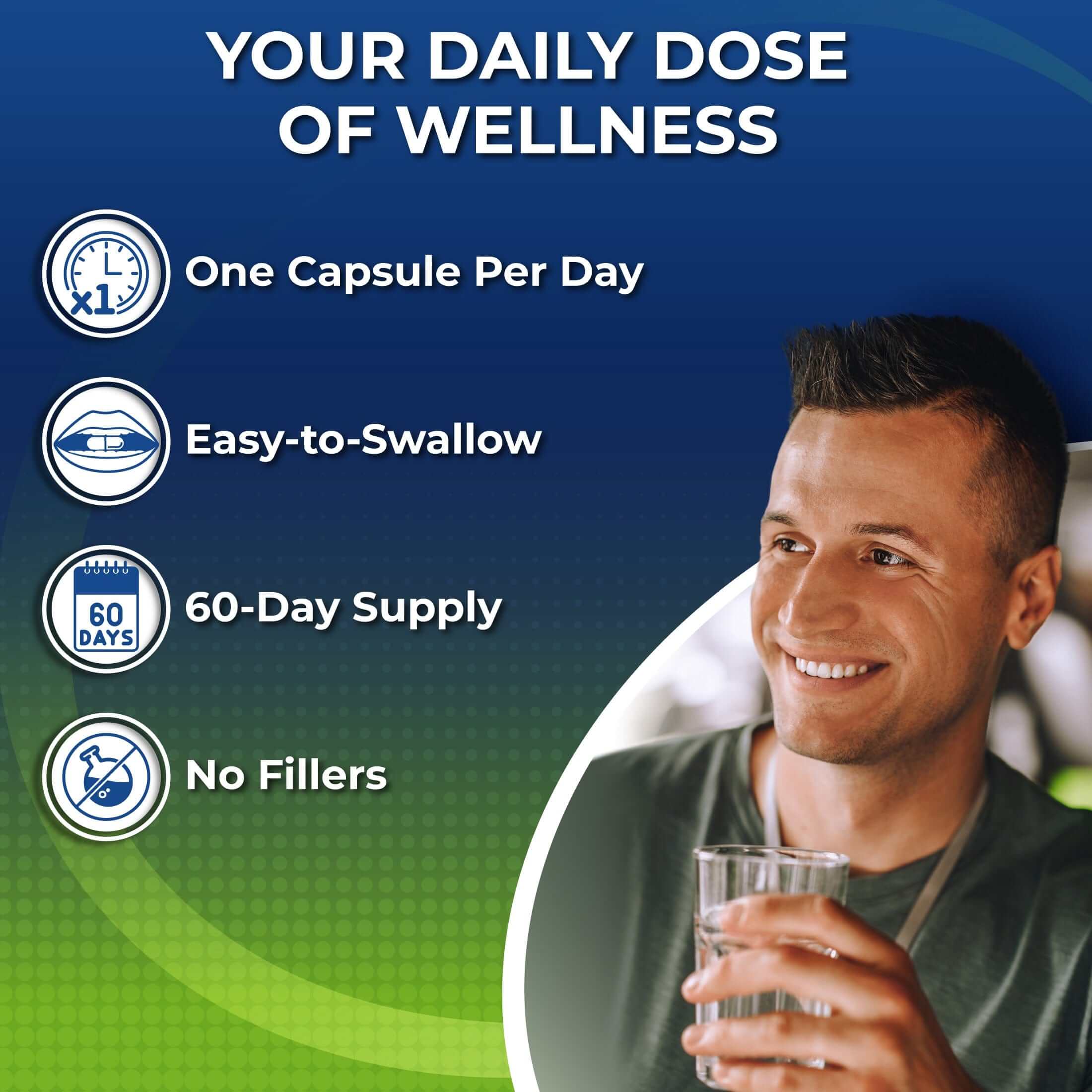 Crafted with your health in mind and free from fillers like rice flour and magnesium stearate, our men's daily multivitamin capsules deliver high-potency benefits without the unwanted extras so you can trust what you're putting into your body.