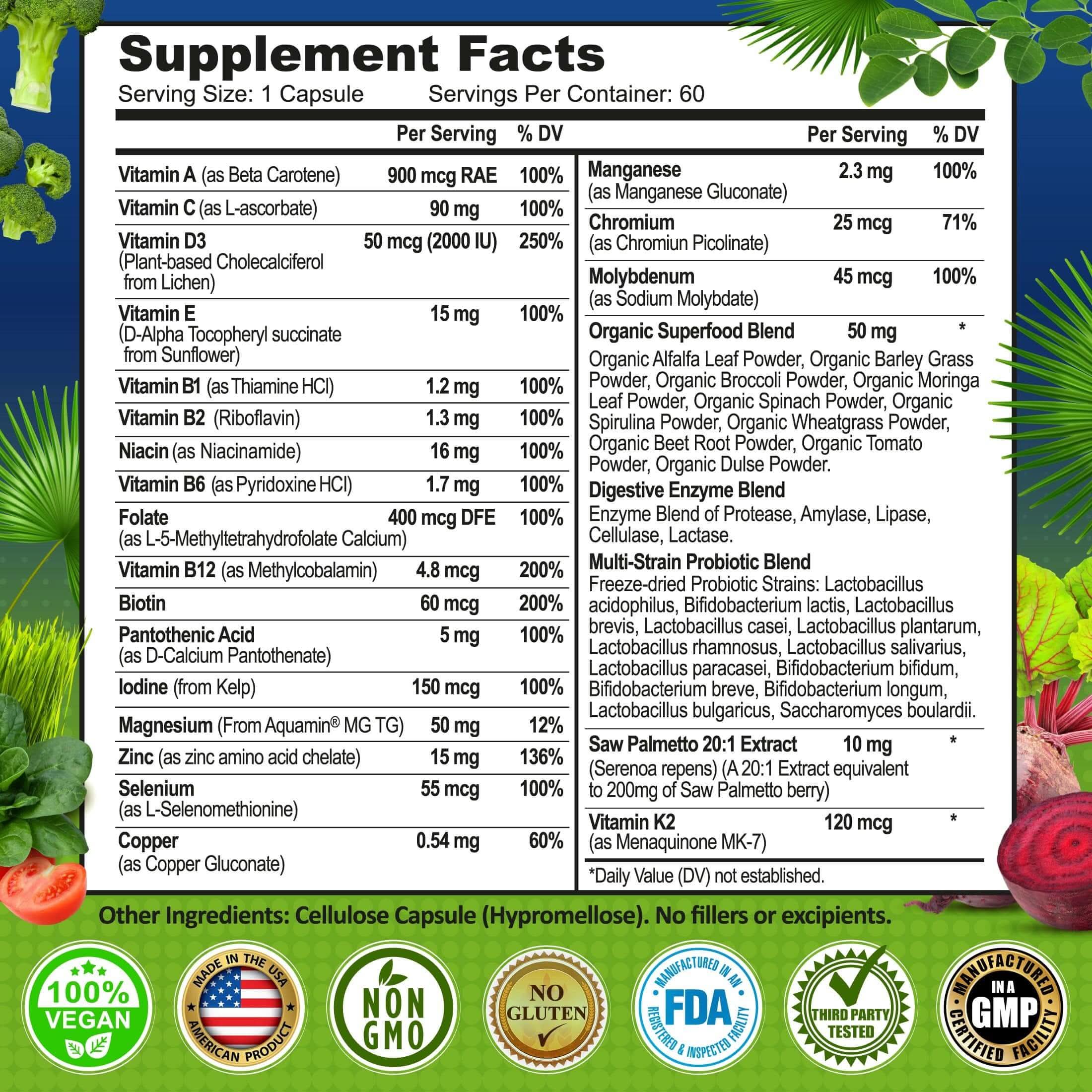 Enriched with Organic Superfood Blend, this superior-quality, plant-based multivitamin supports optimal health. Made without artificial fillers, colors, or flavors, it contains NO magnesium stearate, preservatives, or GMOs. Free from gluten, wheat, nuts, dairy, eggs, shellfish, soy, and gelatin, it’s crafted in a GMP-certified facility in the USA and rigorously third-party tested to ensure purity and quality.