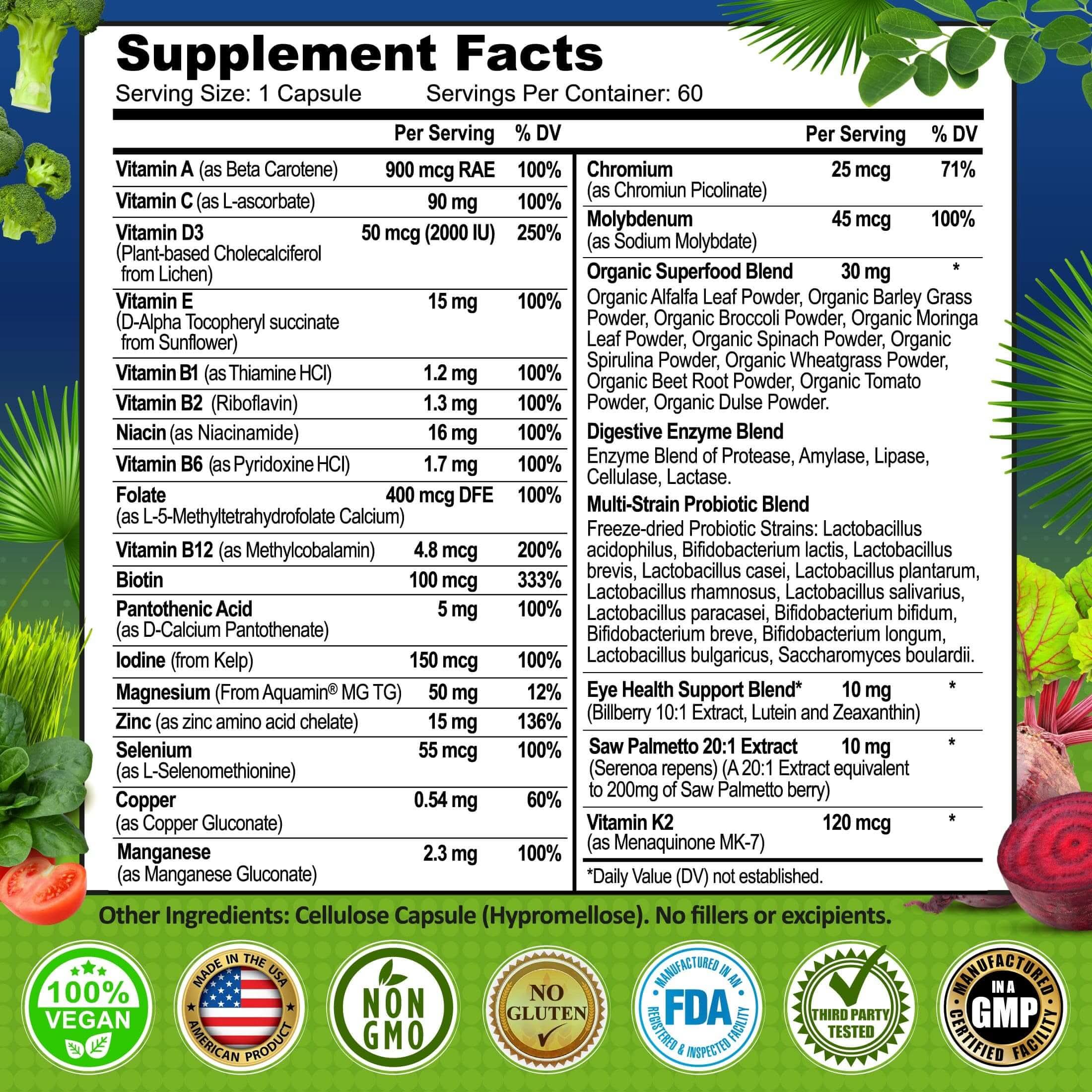 Enriched with Organic Superfood Blend, this superior-quality, plant-based multivitamin supports optimal health. Made without artificial fillers, colors, or flavors, it contains NO magnesium stearate, preservatives, or GMOs. Free from gluten, wheat, nuts, dairy, eggs, shellfish, soy, and gelatin, it’s crafted in a GMP-certified facility in the USA and rigorously third-party tested to ensure purity and quality.
