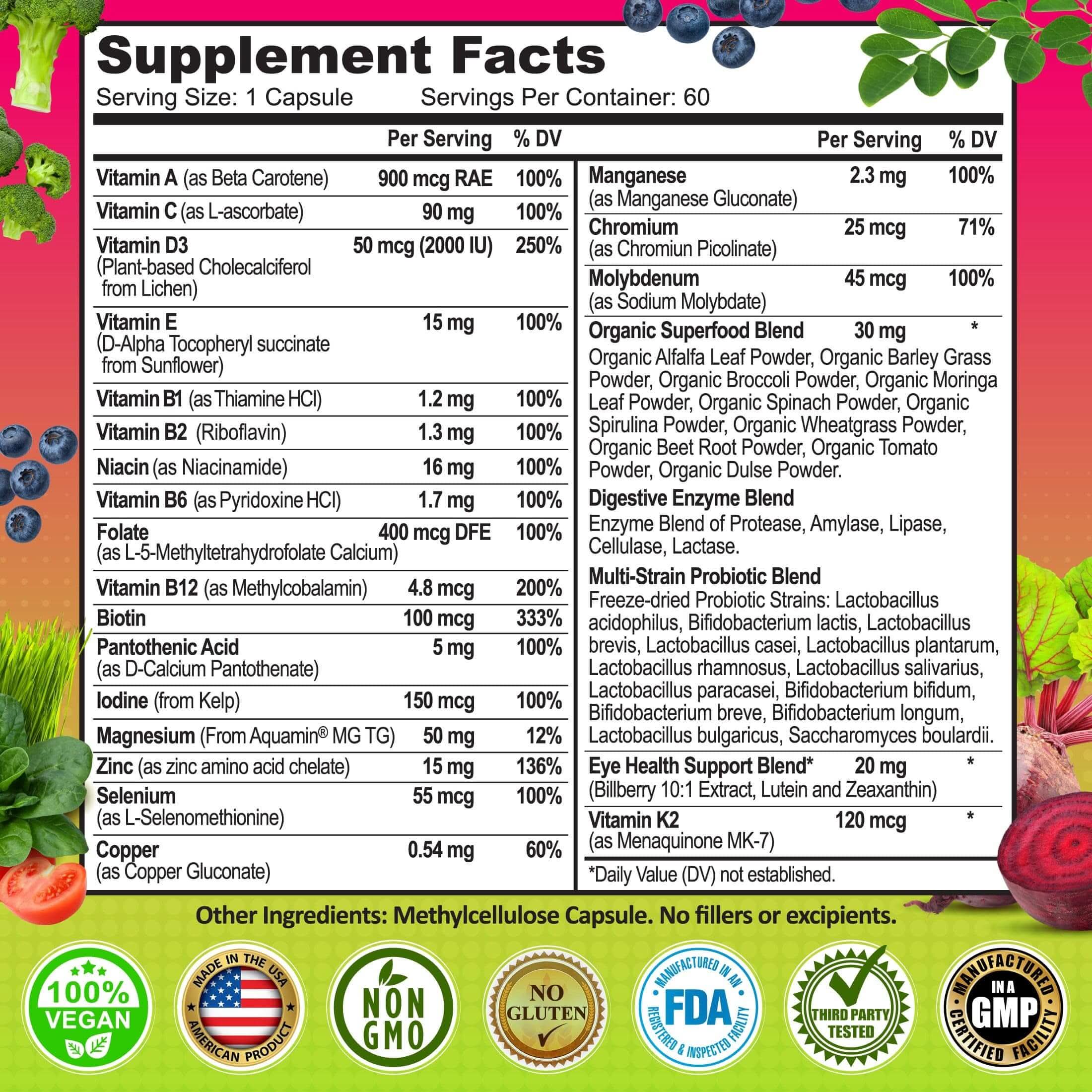 Enriched with Organic Superfood Blend, this superior-quality, plant-based multivitamin supports optimal health. Made without artificial fillers, colors, or flavors, it contains NO magnesium stearate, preservatives, or GMOs. Free from gluten, wheat, nuts, dairy, eggs, shellfish, soy, and gelatin, it’s crafted in a GMP-certified facility in the USA and rigorously third-party tested to ensure purity and quality.